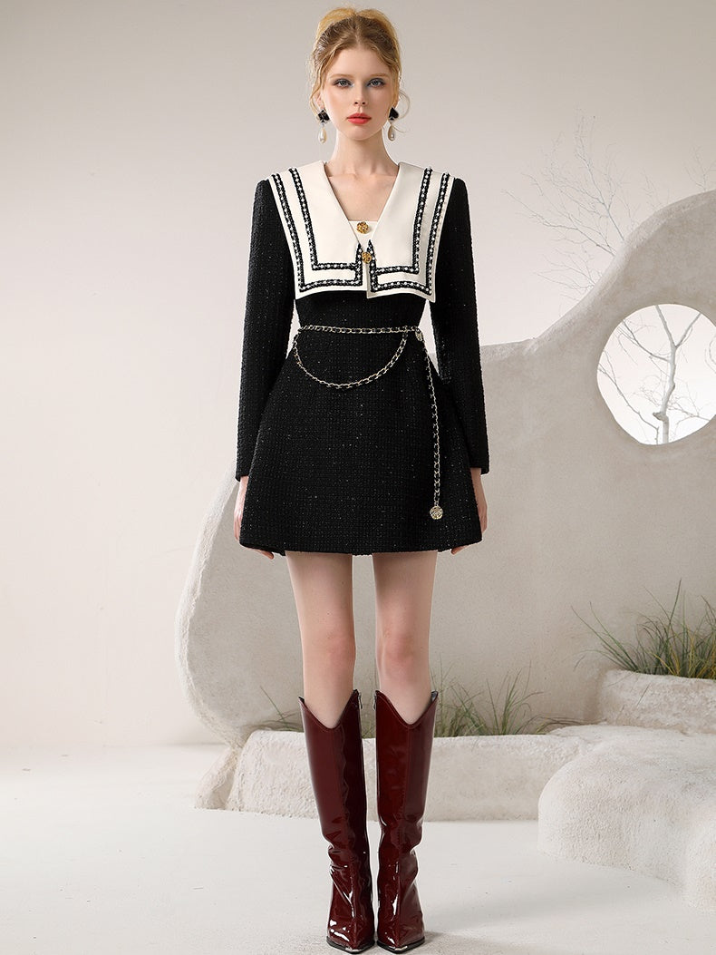 Tweed Sailor Big-Collar Pearl Chain One-Piece